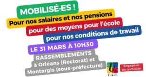 La FSU, la CFDT Éducation Formation et Recherche Publiques, la CGT Educ’Action et SUD Éducation appellent à une journée de grève le mardi 31 mars et à se rassembler à Orléans à 10h30 devant le rectorat et à Montargis à 10h30 devant la sous préfecture